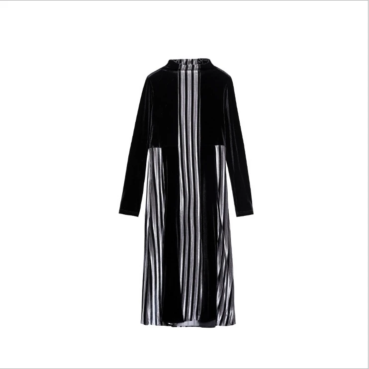 Kopen Goedkoop Europa en de Verenigde Staten 2018 herfst nieuwe mode temperament hoge kraag verticale strepen goud fluwelen jurk vrouwelijke Prijs