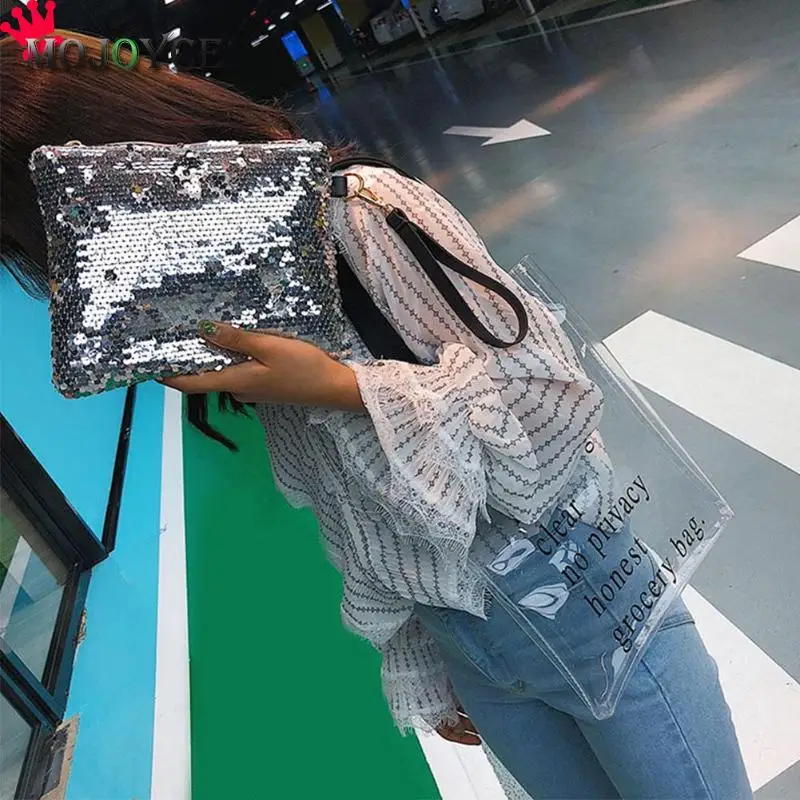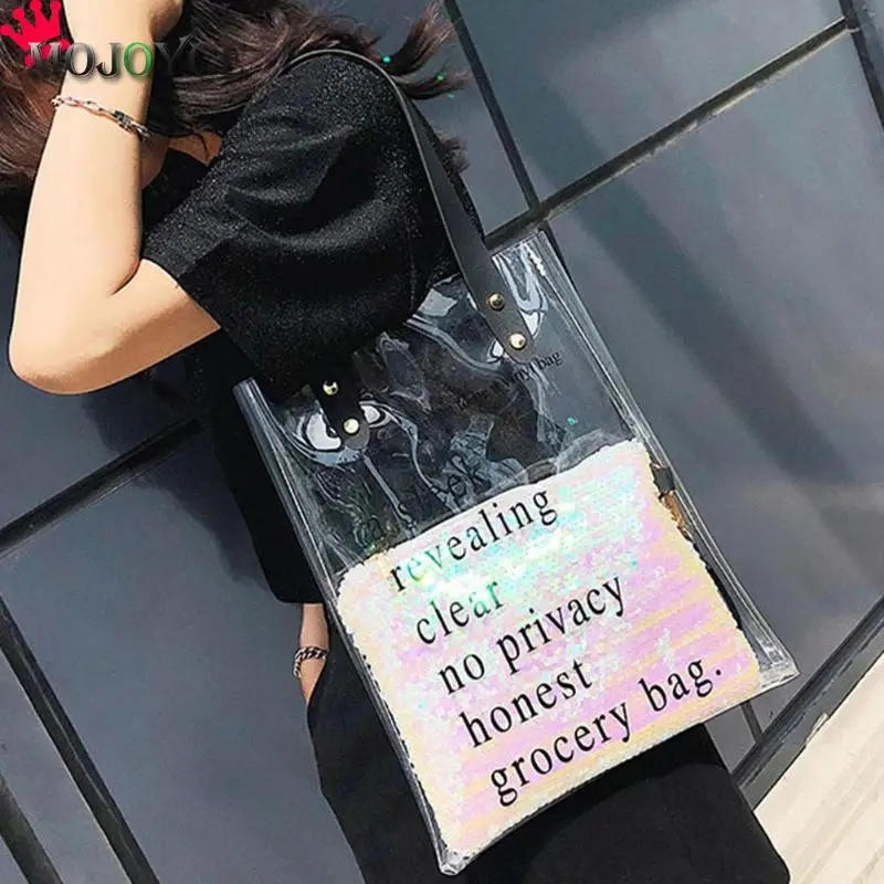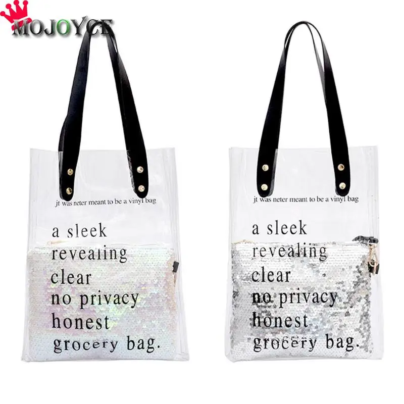 Beste Koop 2018 Zomer Nieuwe Clear PVC Tote Vrouwen Plastic Strand Handtassen Zomer Winkelen Schoudertassen Transparante Pocket Pailletten Kleine Tas Goedkoop