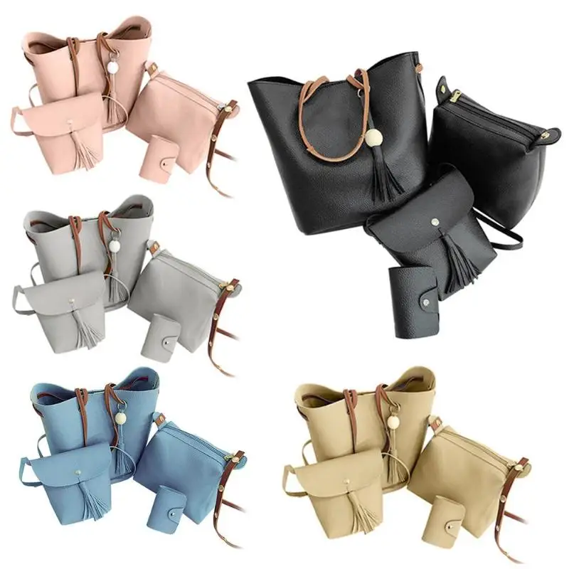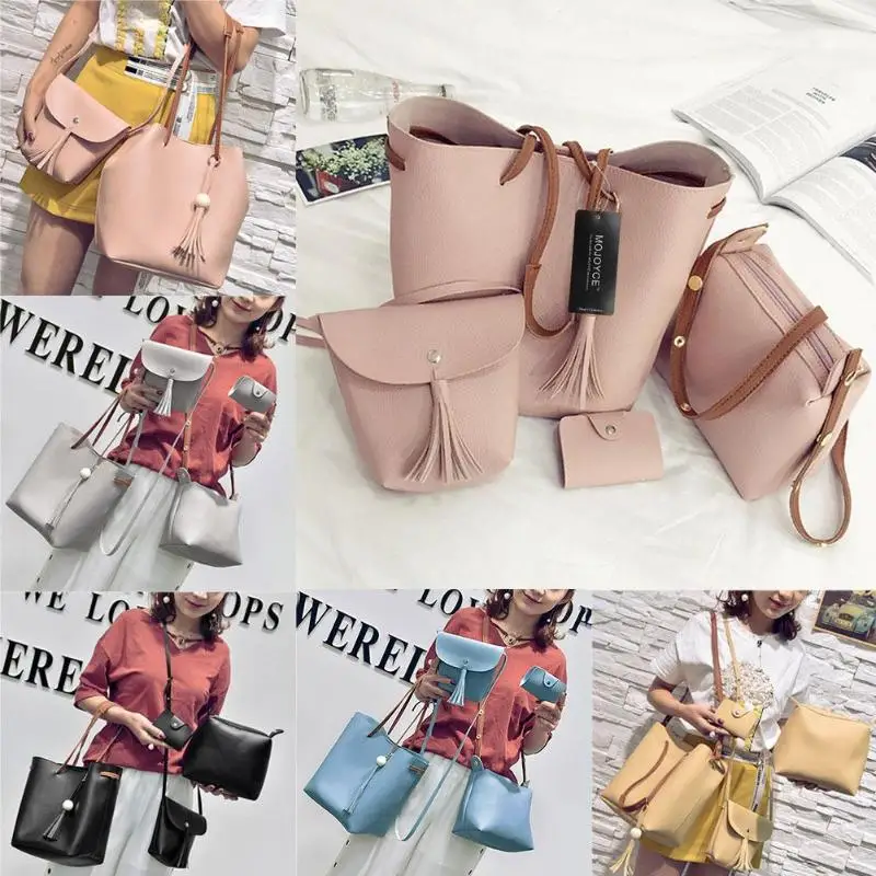 Beste Kopen 4 stks set Mode Vrouwen Composite Bag Kwastje Pure PU Lederen Schoudertas Vrouwen Clutch Handtas Set Grote Tote Vrouwelijke Winkelen tas Goedkoop.