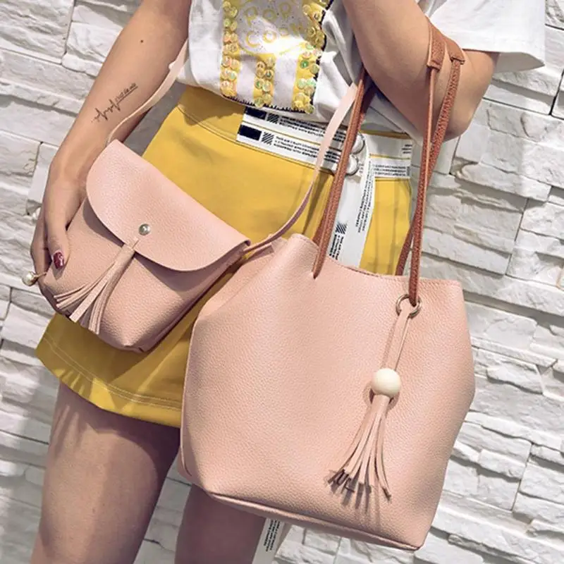 Goede Kopen 4 stks set Mode Vrouwen Composite Bag Kwastje Pure PU Lederen Schoudertas Vrouwen Clutch Handtas Set Grote Tote Vrouwelijke Winkelen tas Goedkoop